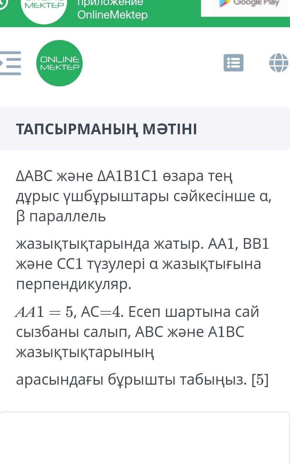Правые треугольники ABC и A1B1C1 лежат в параллельных плоскостях a и b соответственно. Прямые AA1, BB1 и CC1 перпендикулярны плоскости a. AA1 = 5, AC = 4. Постройте схему согласно условиям расчета и найдите угол между плоскостями ABC и A1BC