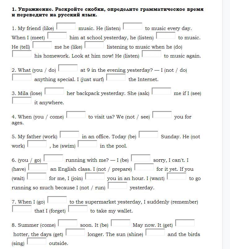 1. Упражнение. Раскройте скобки, определите грамматическое время и переведите на русский язык.