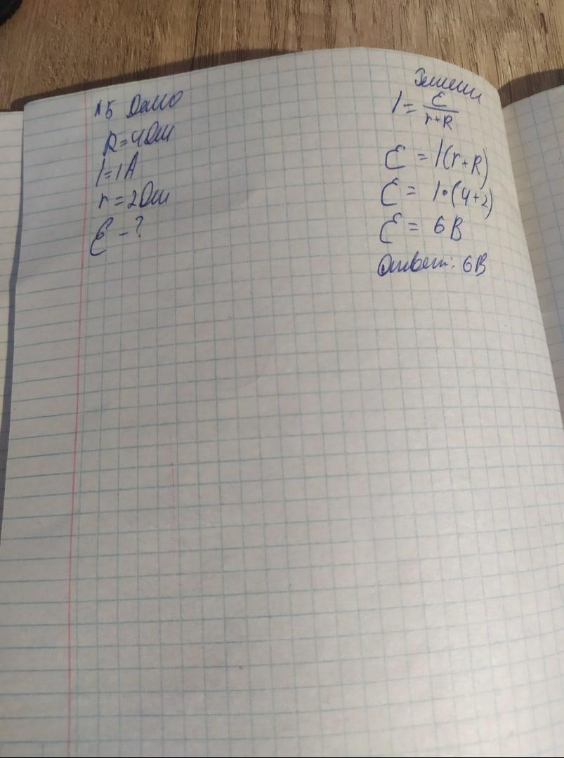 5. Определить эдс, если при внешнем сопротивлении 4 Ом сила тока в цепи равна 1 А, а при внутреннем сопротивление 2 Ом.