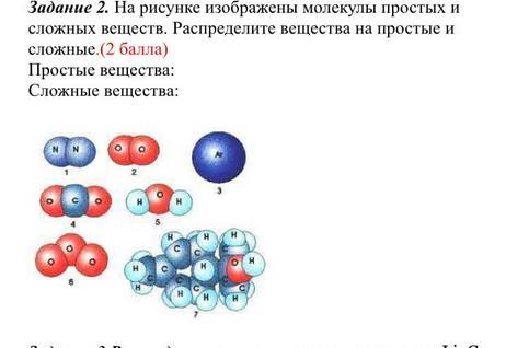 На рисунке изображены молекулы простых и сложных веществ. Распределите вещества на простые и сложные.