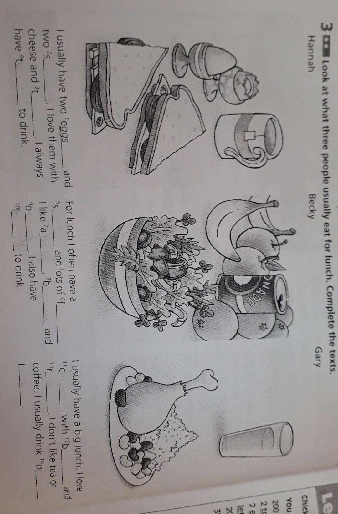 3. I usually have a big lunch. I love chicken with beans and rice. I don't like tea or coffee. I usually drink orange juice.