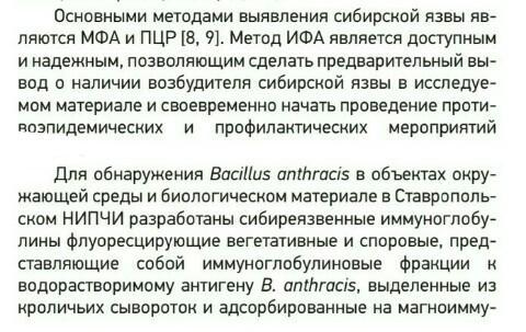 Лабораторная диагностика включает бактериоскопический и бактериологический методы, а в целях ранней диагностики — иммунофлюоресцентный. Применяют также аллергологическую диагностику сибирской язвы путём внутрикожной пробы с антраксином, дающей положительные результаты после 5-го дня болезни.