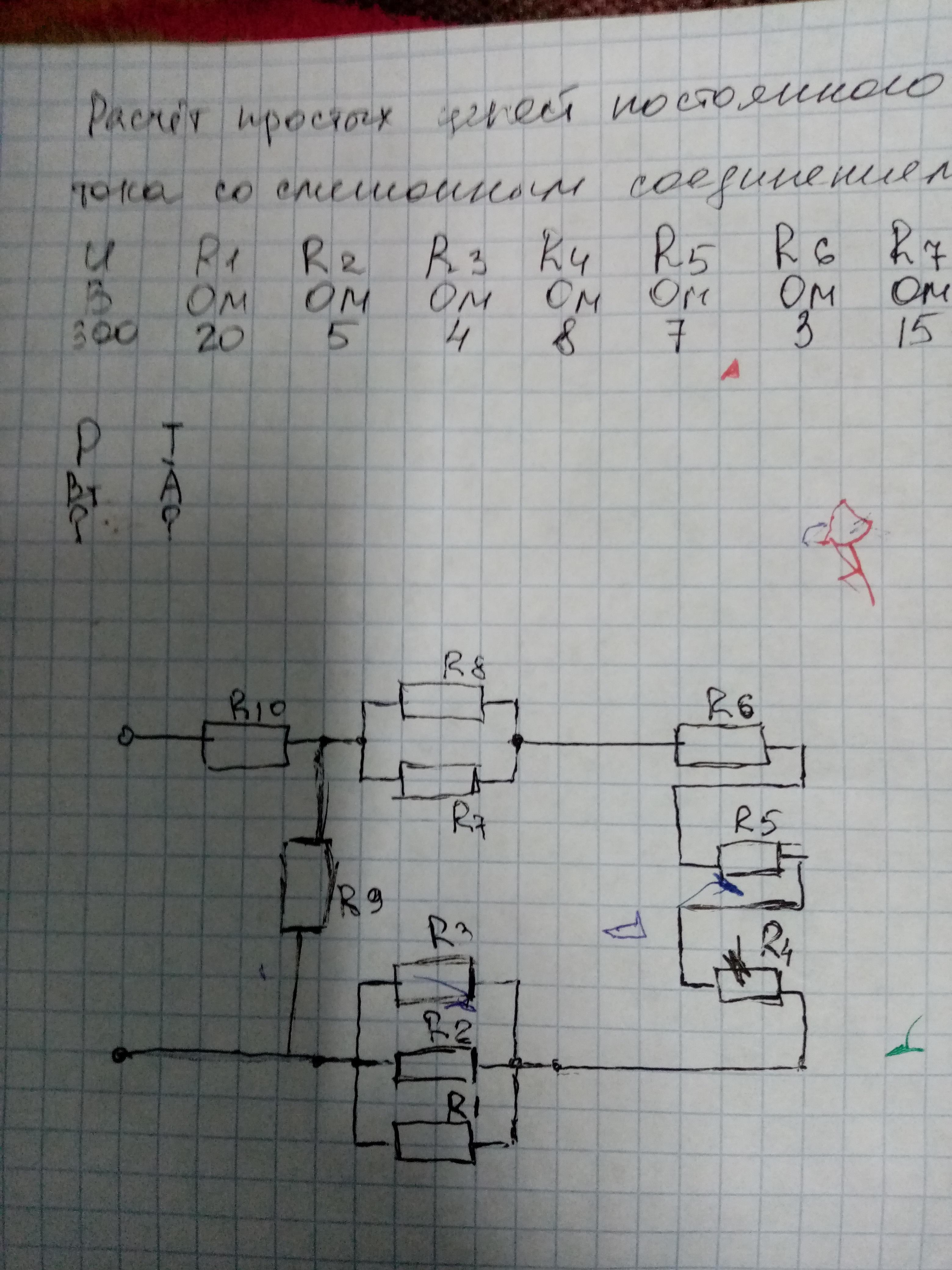 Эта задачка не из тяжелых, резисторы R1-R8 ( включительно ), а точнее их общее сопротивления можно представить как один резистор , который подключен паралельно резистору R9. А дальше там легче простого, главное допишите значения резисторов R8-R10, после чего я с легкостью найду общее сопротивления всей цепи, и соответственно ток, который в не протекает и т. д.