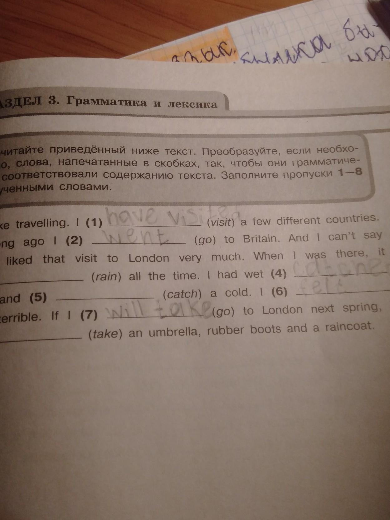 I like travelling. I (1) have visited a few different countries. Not long ago I went to Britain. And I can't say that I liked that visit to London very much. When I was there, it was raining all the time. I had wet (4) feet and (5) caught a cold. I (6) felt terrible. If I (7) go to London next spring, I (8) will take an umbrella, rubber boots and a raincoat.
