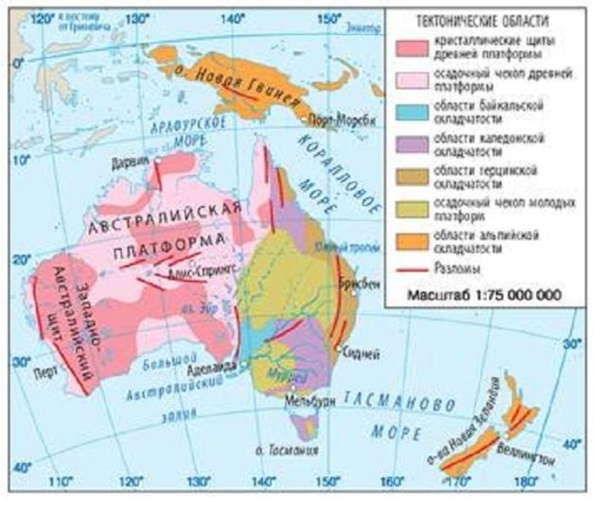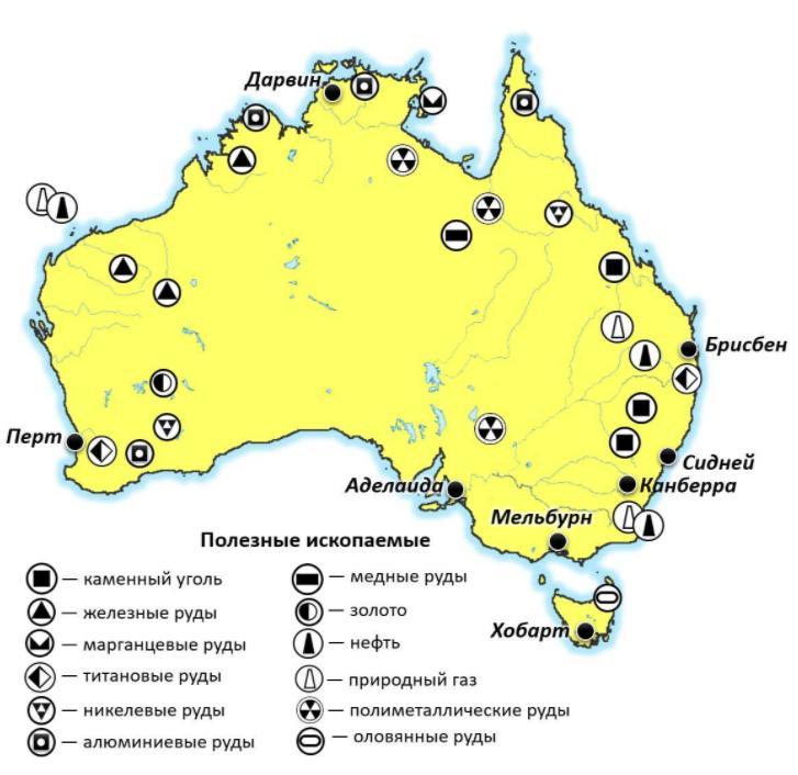 Если мы посмотрим на карту полезных ископаемых Австралии, которая дана ниже в приложении, то увидим, что нефтяные и газовые месторождения сосредоточены на западном и восточном побережьях.Железные руды на северо-западе, на выступе кристаллического фундамента древней докембрийской платформы (щите).Каменный уголь на восточном побережье в межгорных прогибах, в областях герцинской и каледонской складчатостей.Алюминиевые руды расположены на севере и юге материка на щитах и платформенных областях.Марганцевые руды расположены на севере, на острове Грут-Айленд.Медные руды расположены на востоке в области герцинской и каледонской складчатости, а также на севере на щите.Золото расположено в западных областях на щите.Титановые руды на западном и восточном побережье.