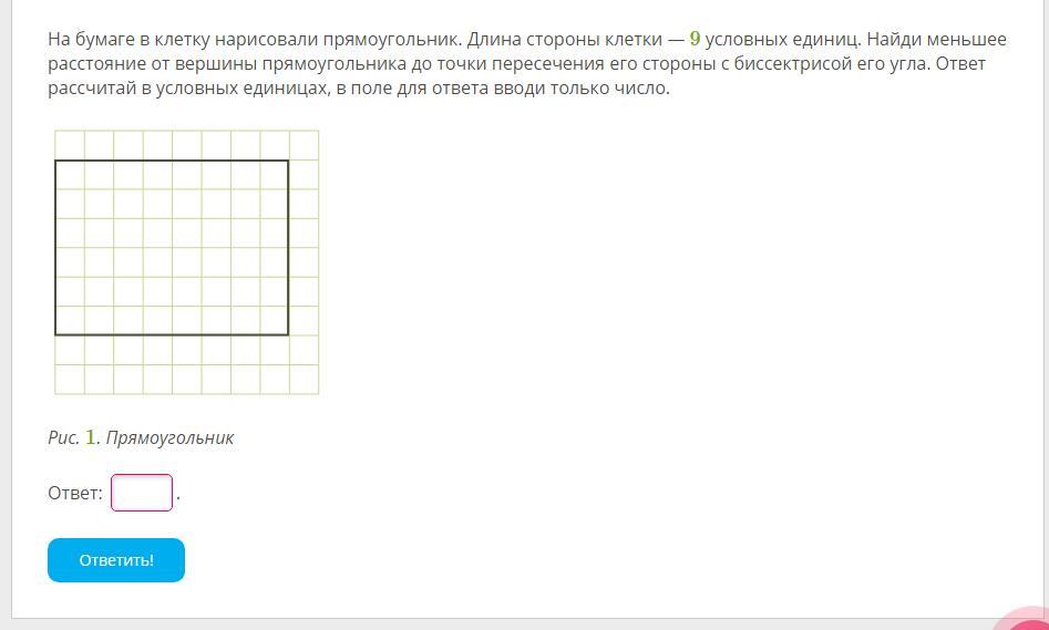 На бумаге в клетку нарисовали прямоугольник. Длина стороны клетки — 9 условных единиц. Найди меньшее расстояние от вершины прямоугольника до точки пересечения его стороны с биссектрисой его угла. Ответ рассчитай в условных единицах, в поле для ответа вводи только число.