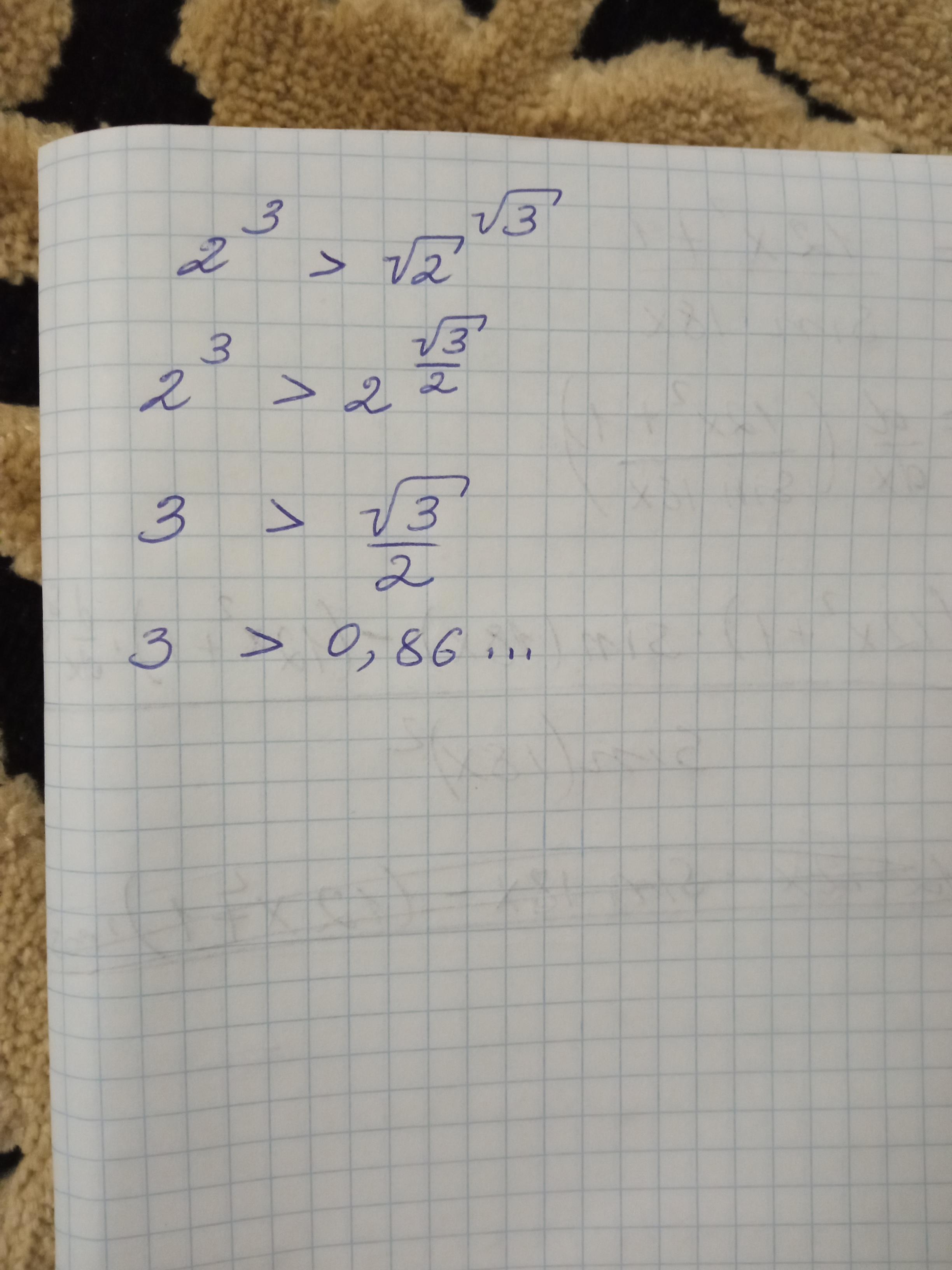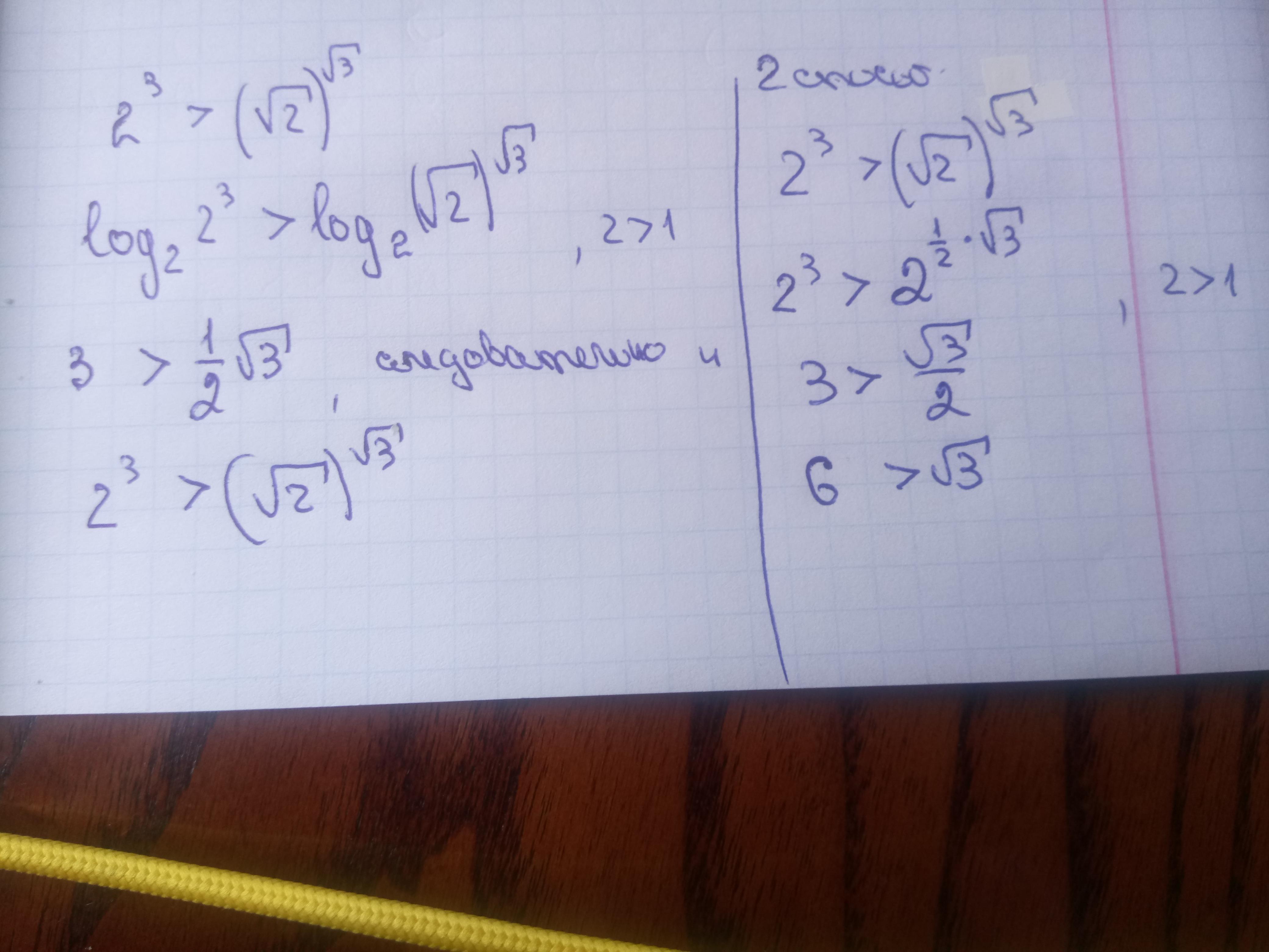 кароч,1 < корень из 3 < 2 след. (√2)^(между 2 и 1) след. √2^√3 меньше 2^1 а предыд выражение вообще 2^3 следовательно это выражение больше второго