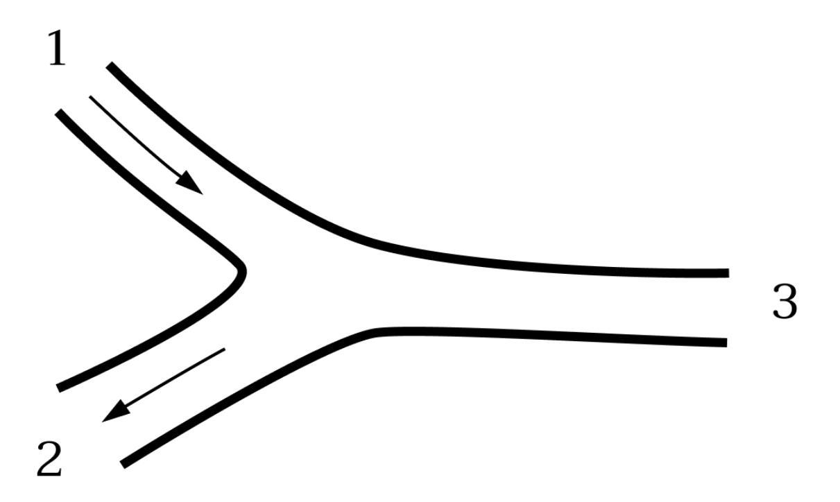 Участок трубопровода состоит из трёх труб так, как показано на рисунке. Через сечение трубы 1 за минуту протекает 5 л воды, а через сечение трубы 2 — 7 л воды. (см. рисунок).