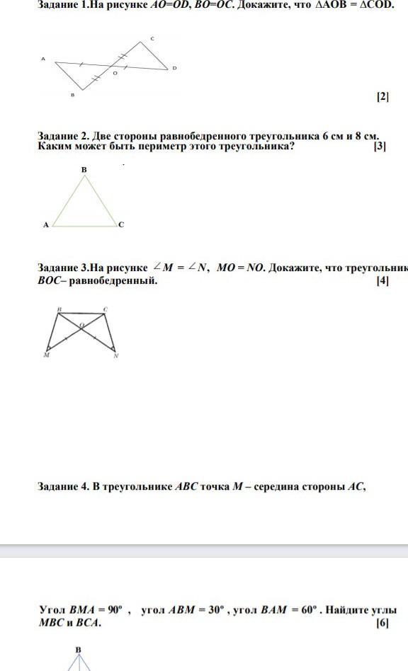 - 1) равны по двум сторонам и углу между ними( так как углы вертикальные, значит равны). 2) 6+6+8=20 или 8+8+6=22 . 3) треугольник мво = треугольнику соn. по стороне и прилежащим двум углам ( м=n ; Угол О вертикальный) . поэтому ов = ос. треугольник вос равнобедренный. 4) мвс=30 а вса=60