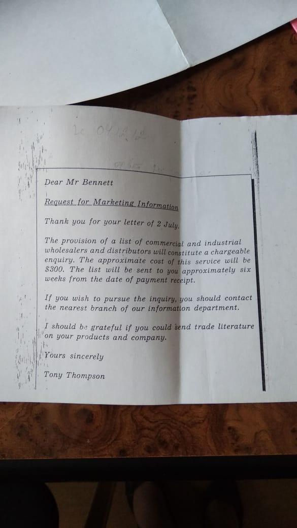 Спасибо за ваше письмо от 2 июля Предоставление списка коммерческих и промышленных оптовиков и дистрибьюторов является платным запросом.Ориентировочная стоимость этой услуги составит 300 долларов. Список будет отправлен вам примерно через шесть недель с момента получения оплаты.Если вы хотите продолжить расследование, вам следует обратиться в ближайшее отделение нашего информационного отдела.