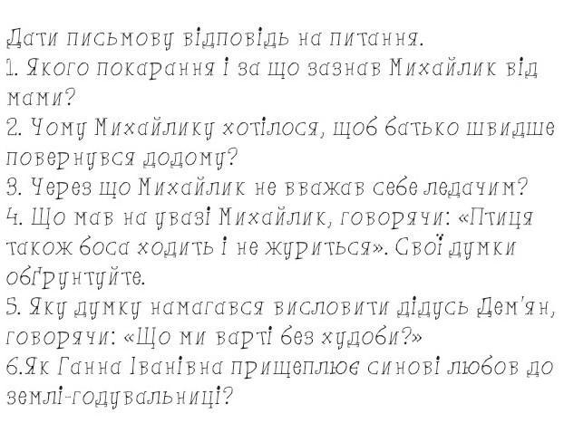 5. Дідусь Михайлика змалечку привчав його бути справжнім господарем. Хлопець ріс у звичайній селянській родині, які з діда-прадіда займалися сільським господарством. Сільськогосподарської техніки в ті далекі час не було, а робота була фізично важка. У кого в дворі не було міцних чоловічих рук, коня, волів міг і не вижити. Тому дідусь і казав Михайликові, що без худоби селянин нічого не вартує.
