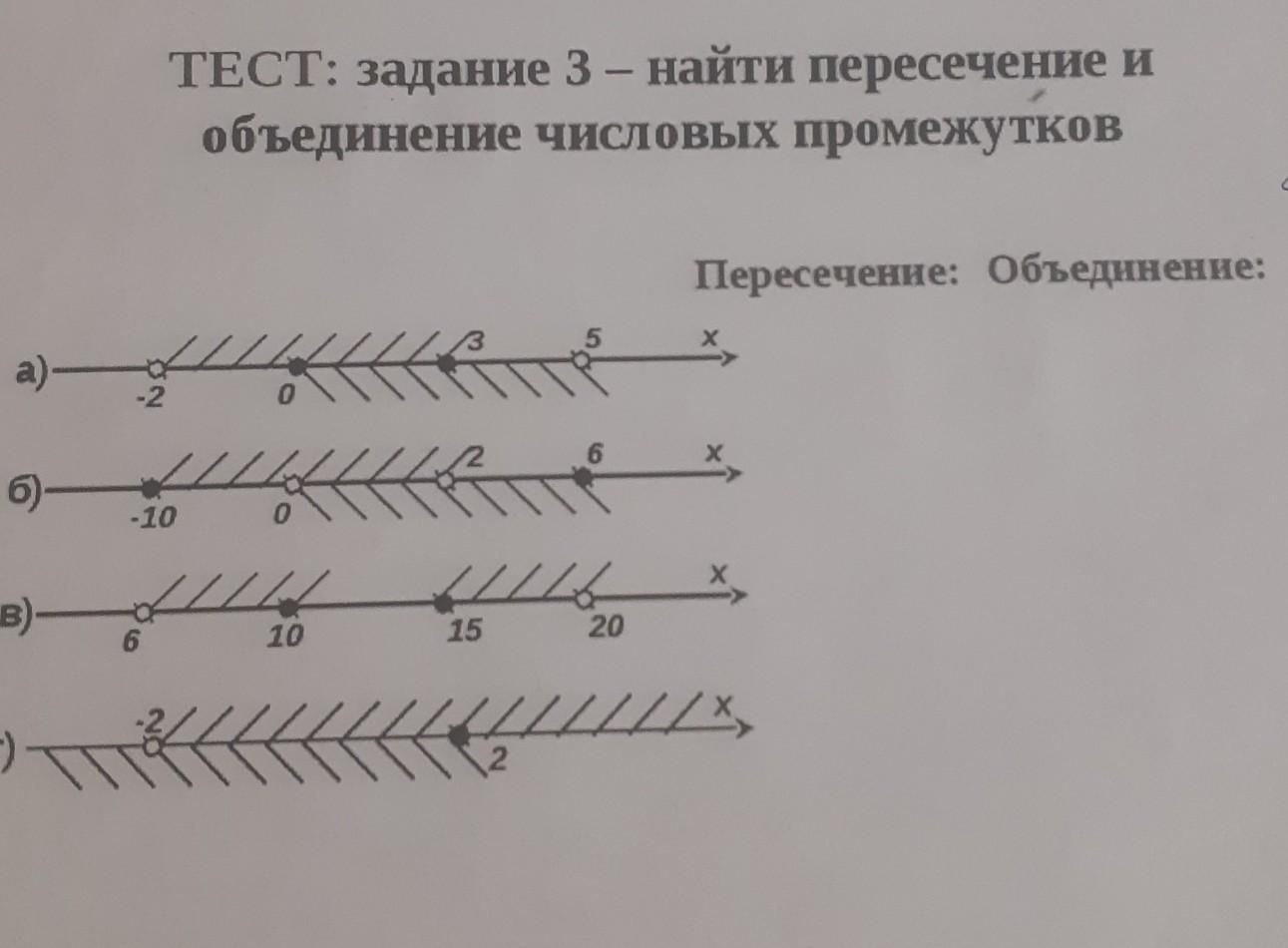 в) Пересечение: ∅, объединение: (6; 10] ∪ [15; 20)