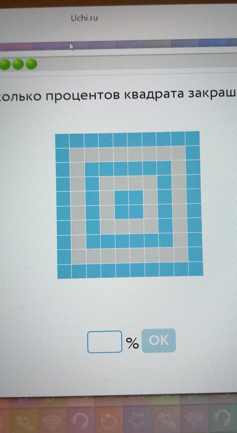 Чтобы найти процент закрашенных нужно разделить закрашенные квадраты на общее количество квадратов и умножить на 100%
