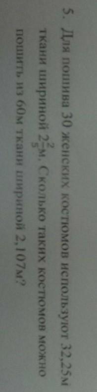 Смотри: общая площадь ткани, нужная на 30 костюмов S = 30м * (2м+2/5м)=77.4 м². Значит за 1 костюм = 77.4 м²/30м= 2.58 м²
