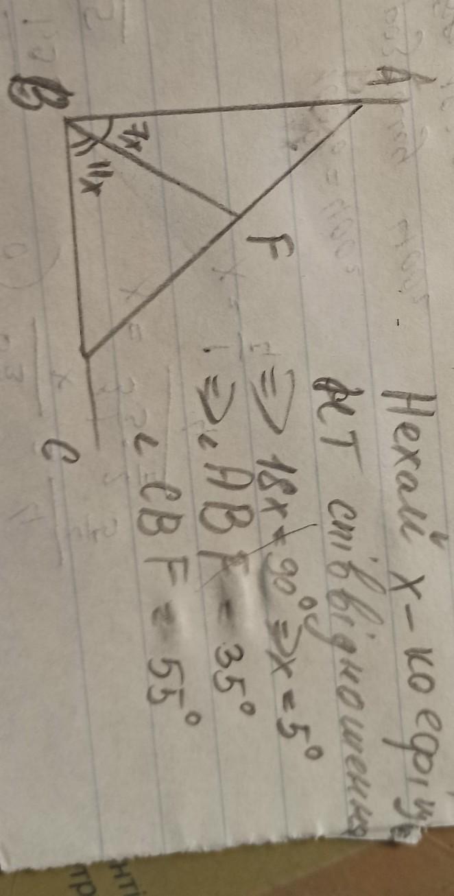 Накресли прямий кут ABC і проведи сторони BF так щоб градусні міри кутів ABF і CBF відносилися на 7 : 11