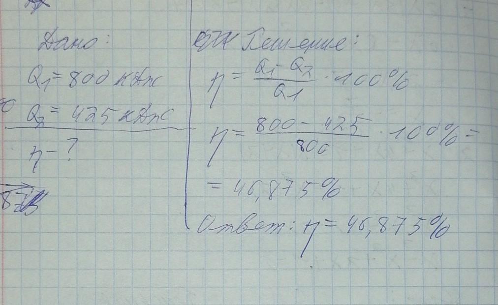 Определите КПД теплового двигателя, если рабочим телом от нагревателя было получено 800 кДж энергии, а передано холодильнику 425 кДж энергии. Запишите решение задачи ниже.