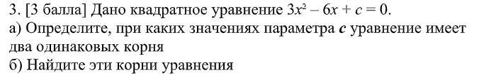 D=√(36-4*3*c)=0 (при D=0 уравнение имеет два одинаковых корня)
