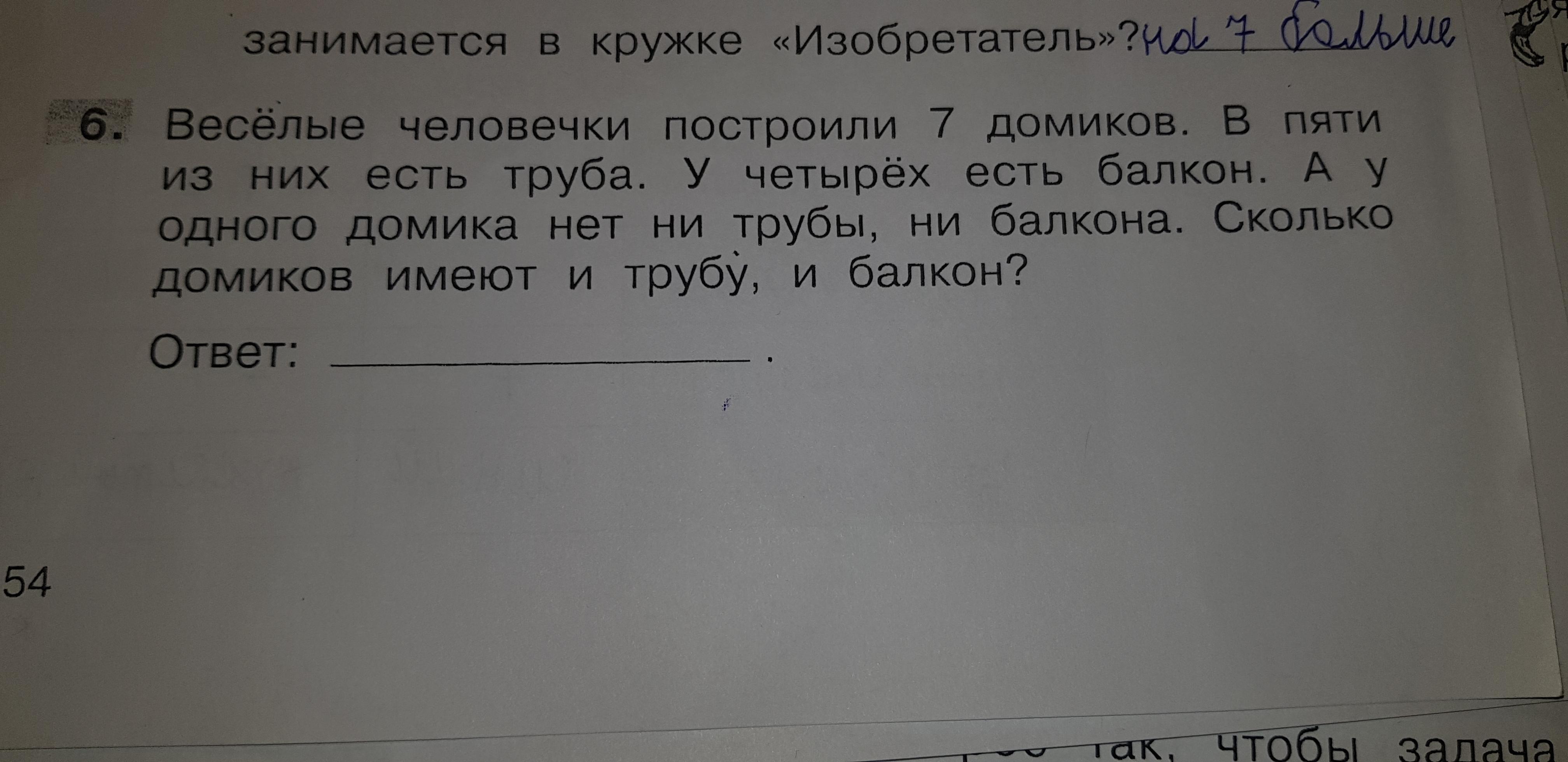 Есть 7 домиков, у всех, кроме одного, есть труба или балкон. Вычитаем 7-1=6. Далее считаем 5+4=9. В эту девятку входят два раза домики, у которых есть и труба, и балкон (на кругах Эйлера это пересечение). Значит, чтобы найти кол-во домиков и с трубой и с балконом, надо 9-6=3, так как в 6 входят один раз домики только с трубой, 1 раз только с балконом, 1 раз с двумя. А в девятку входят также, но 2 раза с двумя. Поэтому просто вычитаем