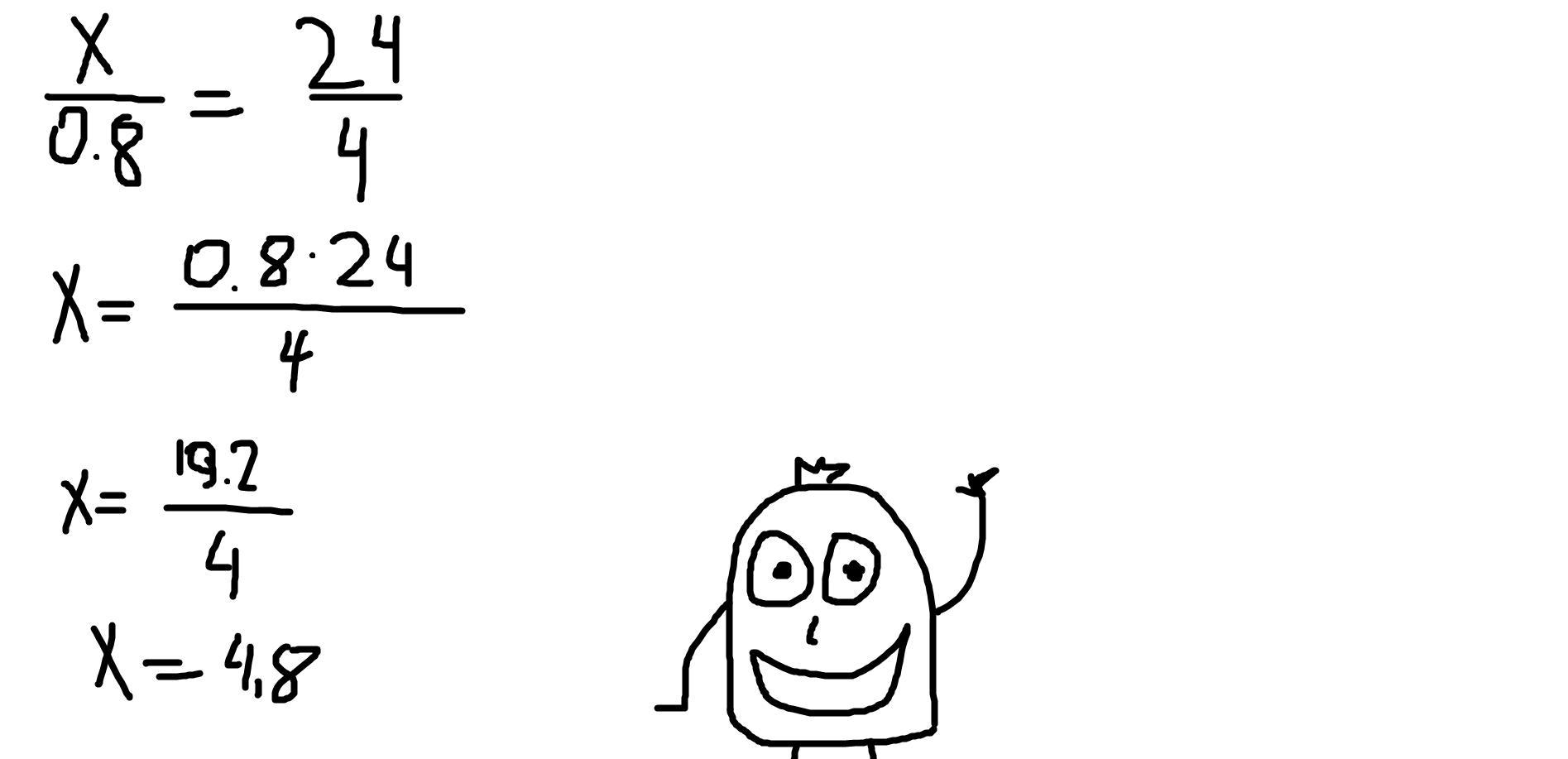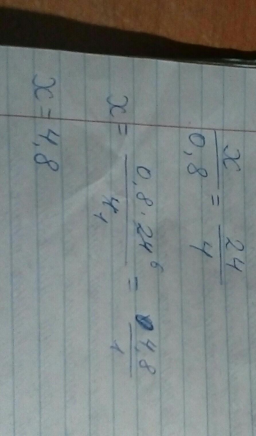можно сначала разделить 24\4=24:4=6 и получить уравнение х:0,8=6, потом х=6*0,8 и получим х=4,8 .А если проходили пропорцию-то решать как пропорцию.Этот способ уже сделали внизу.