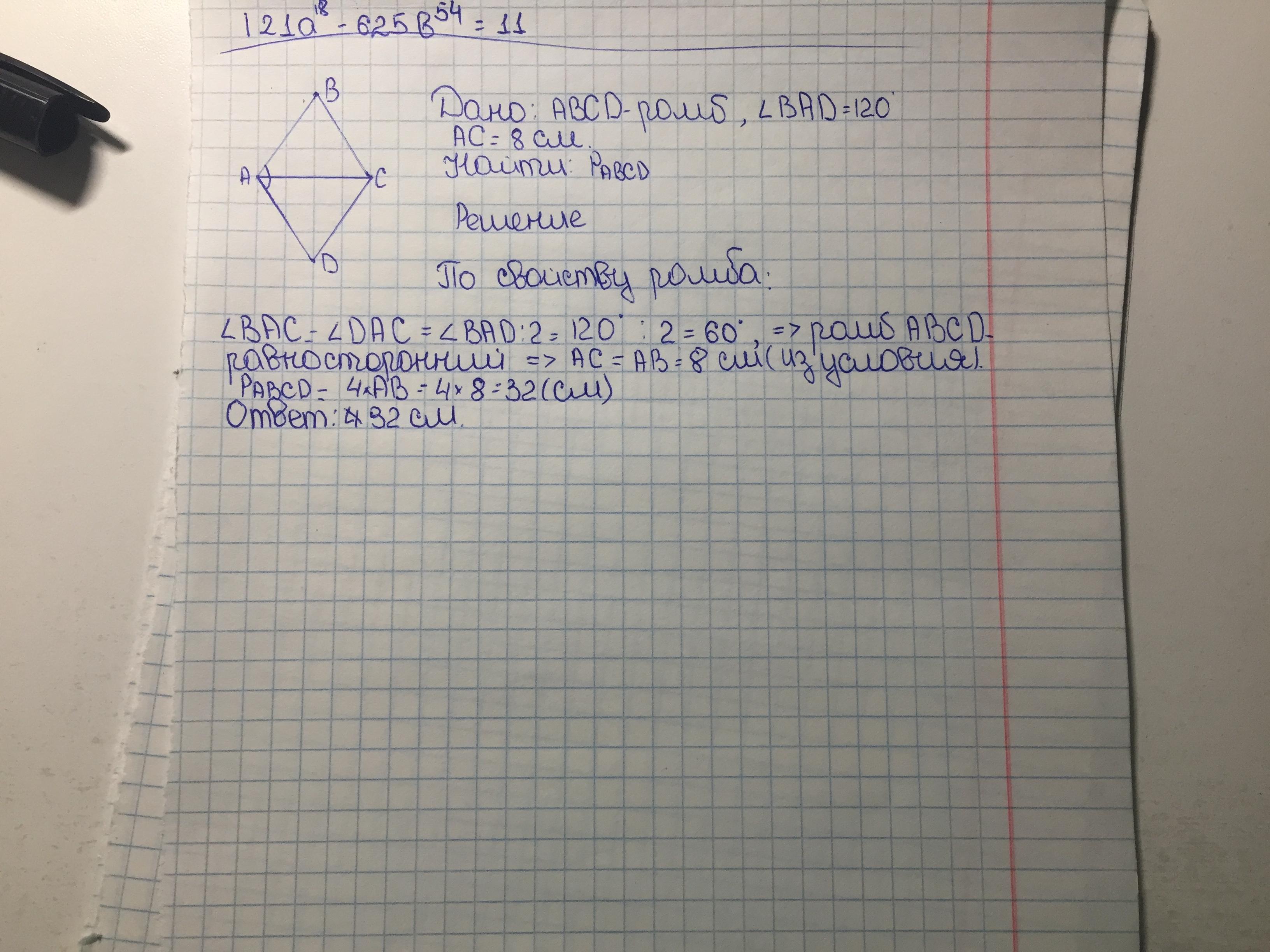 Найдите периметр и высоту ромба, один из углов которого равен 120градусов , а меньшая диагональ равна 8 см.