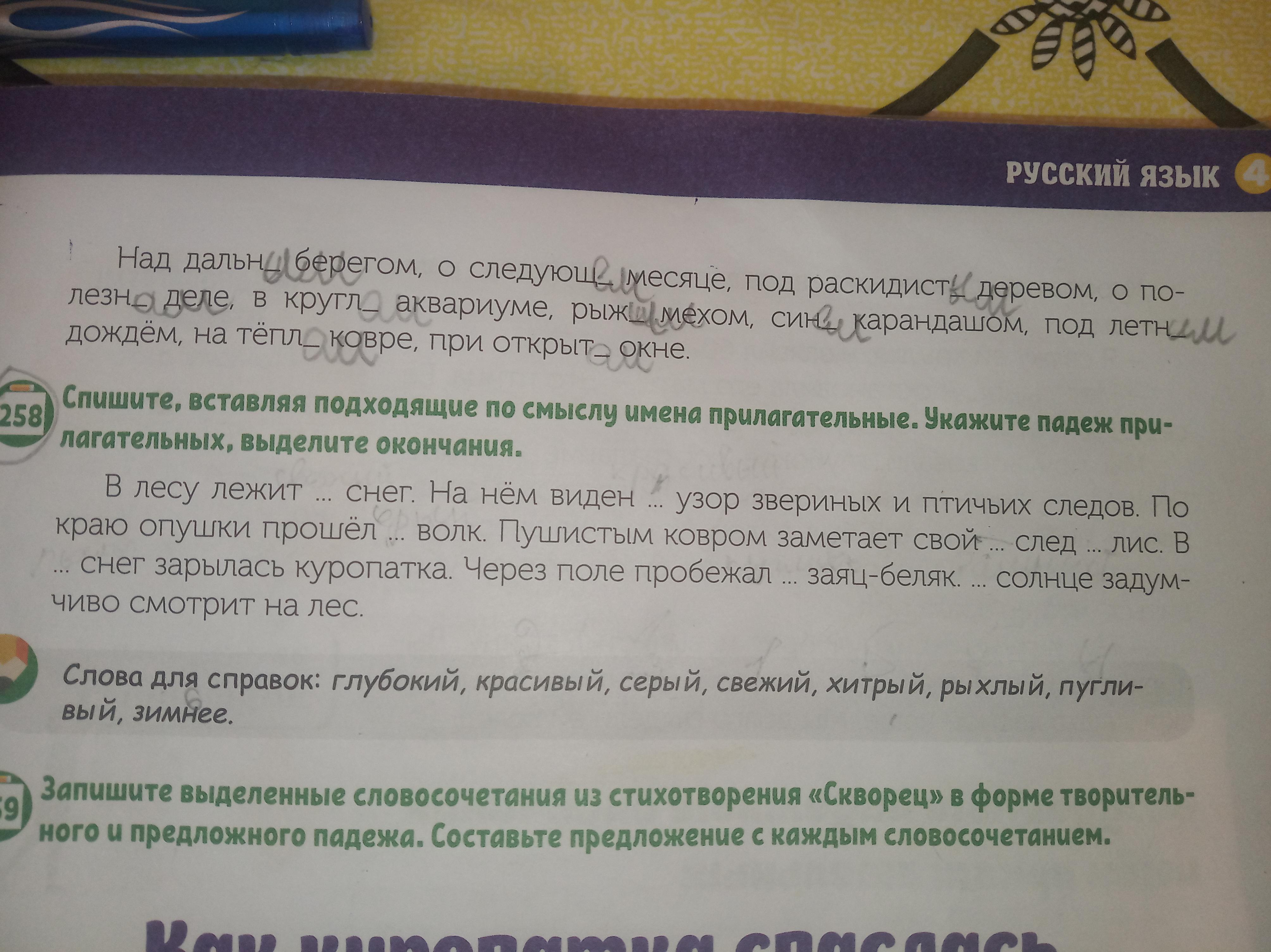 Спишите, вставляя подходящие по смыслу имена прилагательные. Укажите падеж при лагательных, выделите окончания.