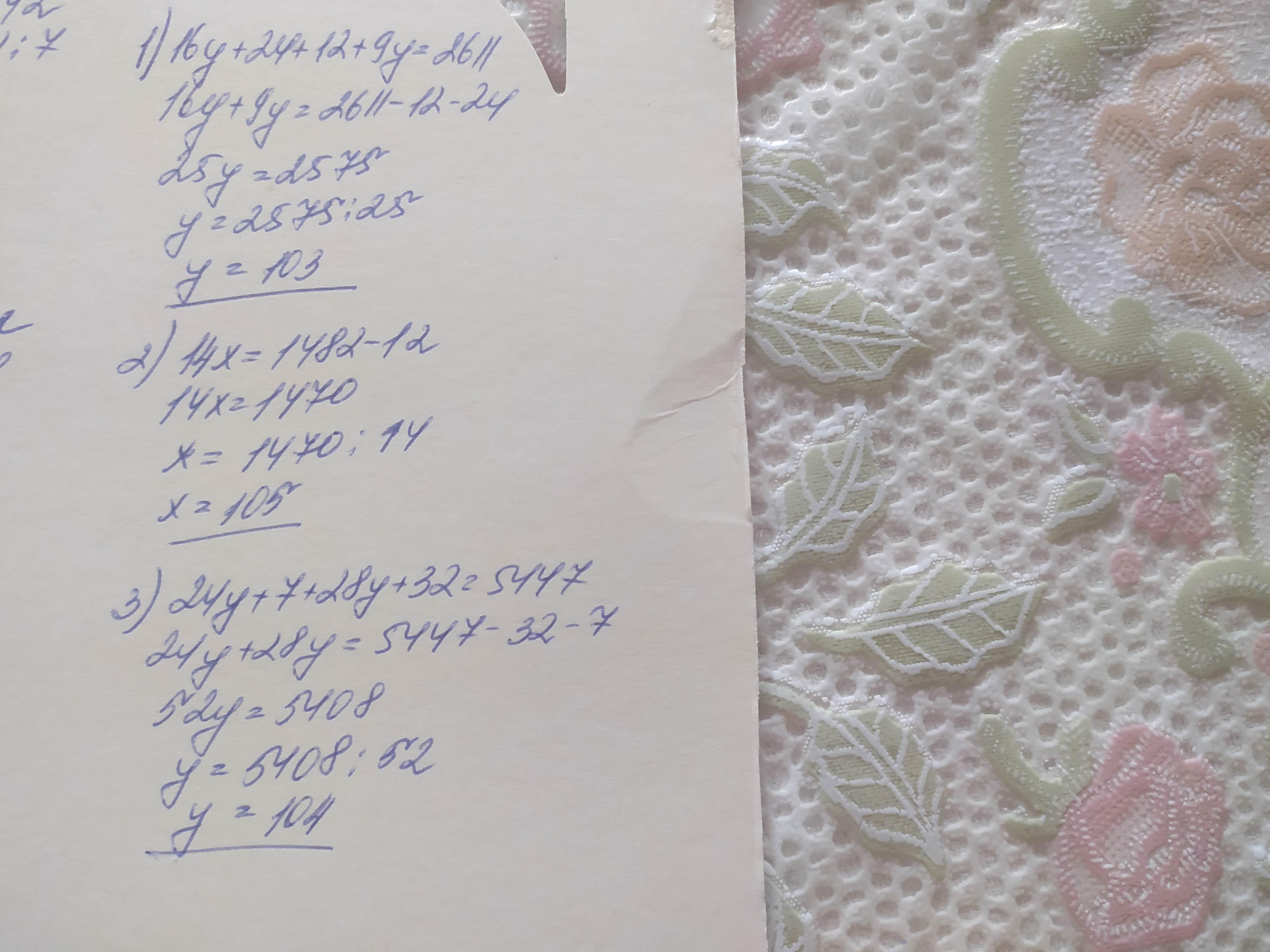 3)24y+7+28y+32=5447<<<24y+28y=52y<<<32+7=39<<<52y+39=5447<<<52y=5447-39<<<52y=5408<<<y=5408:52<<<y=104