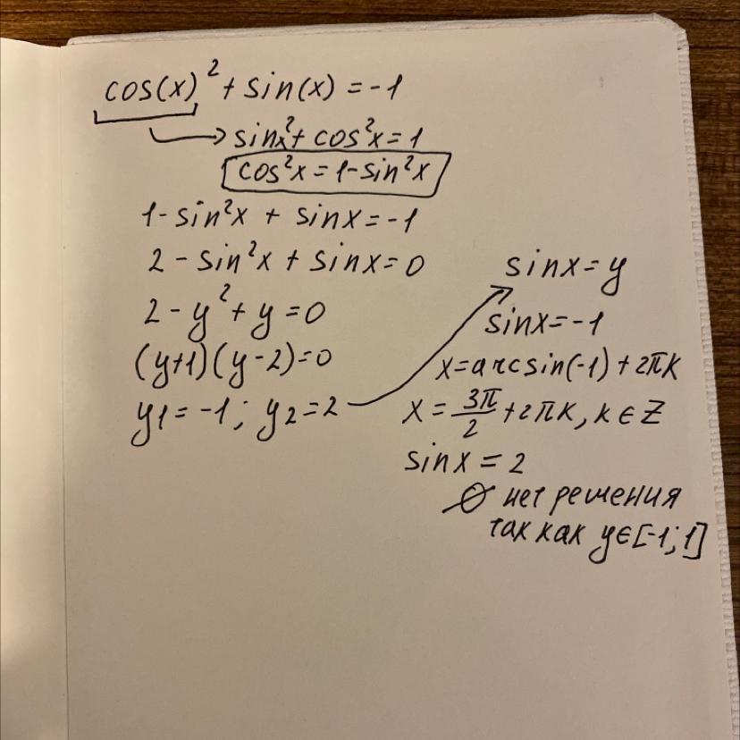 Вместо cosx^2 подставил 1-sinx^2 потом вместо sinx подставил переменную y для того чтобы сделать замену и потом найдя значения y подставил их заново в уравнение sin(x)=y. sin(x)=2 не имеет решения так как область значения sin принадлежит промежутку [-1;1]