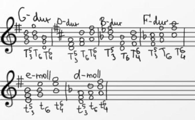 Т53 строится на 1 ступени. При обращении основание аккорда переносится на октаву вверх. У тонического трезвучия есть два обращения : секстаккорд и квартсекстаккорд