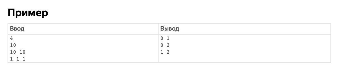 Выводится список пар номеров станций, удовлетворяющих условию (каждая пара — через пробел). Пары должны быть отсортированы по возрастанию по первому номеру, затем — по второму, и пары не должны повторяться, в том числе с изменённым порядком номеров в паре.
