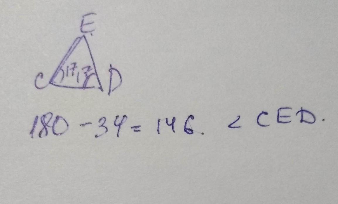 1) Так как ΔCED — равнобедренный, то ∢EDC=∢DCE=17° как углы при основании в равнобедренном треугольнике.