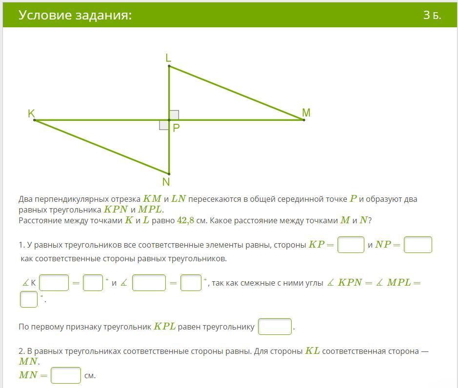 Помогите пожалуйста решить! Два перпендикулярных отрезка KM и LN пересекаются в общей серединной точке P и образуют два равных треугольника KPN и MPL. Далее на картинке, даю 18 балов