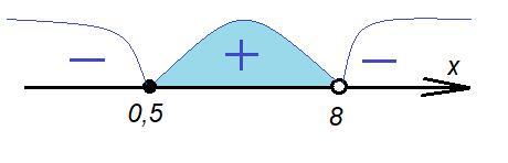 Отметим на числовой оси точки 0,5 (закрашена, так как неравенство не строгое) и 8 (не закрашена, так как превращает знаменатель в ноль). См. приложение.