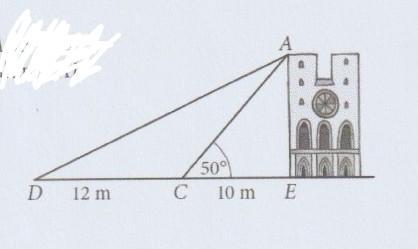 На картинке дана башня замка (AE) и защитный механизм (DC). Известно, что угол ACE = 50°, EC = 10 м, ДC=12 м. Рассчитайте высоту башни замка AE и расстояние AD от берега защитного механизма до вершины башни.