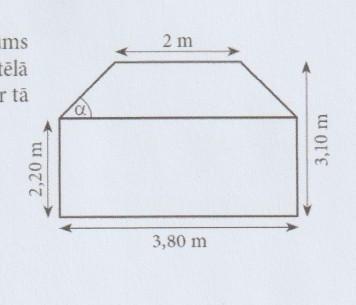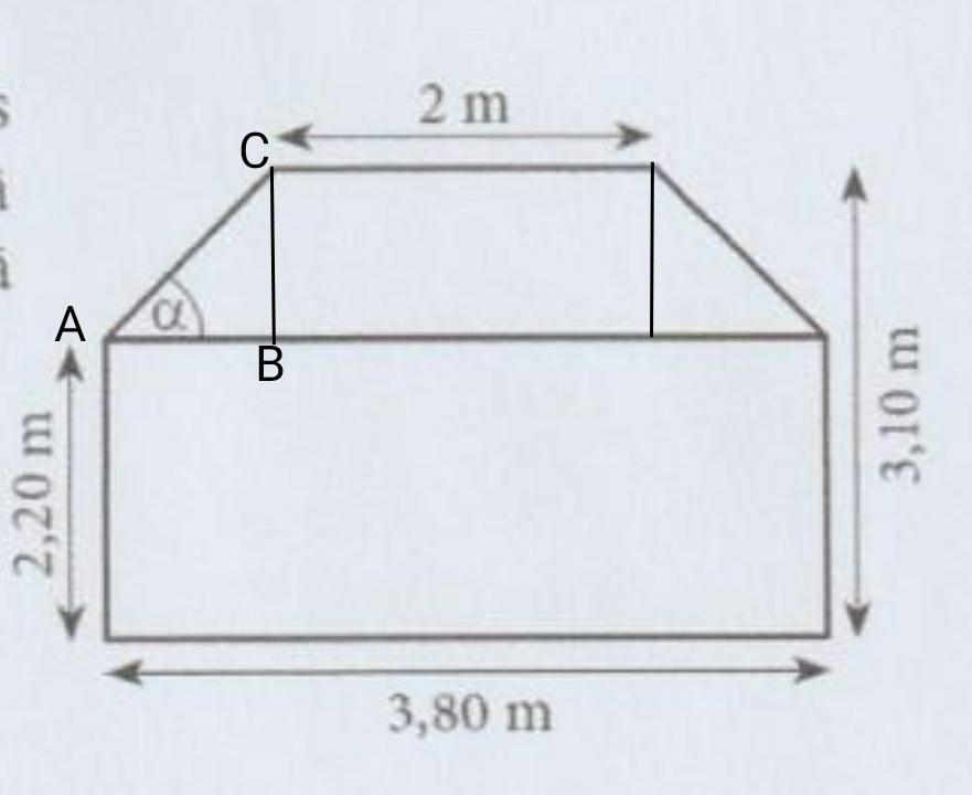 В летнем доме семьи надо построить крышу. Поперечное сечение дома показано на рисунке. Крыше надо быть в форме равнобедренном трапеции. Используя значения, приведенные на рисунке, рассчитайте значение угла, образованной краем ската крыши с его нижним основанием.