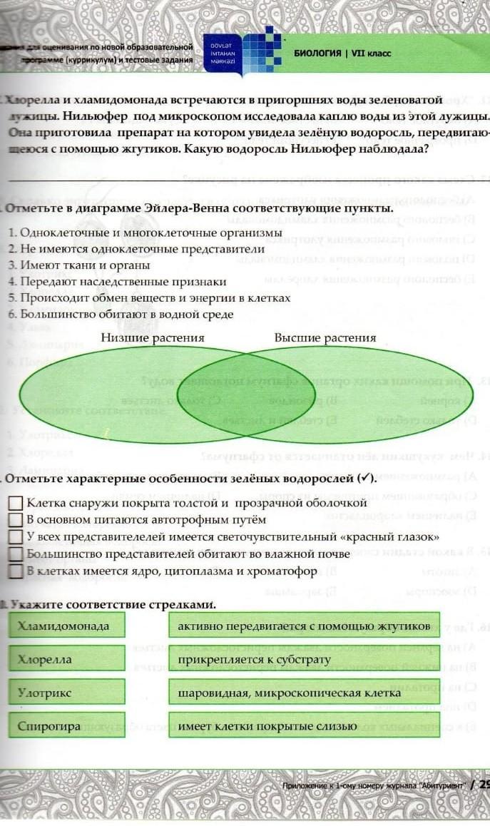2) Особенности зелёных водорослей: клетка снаружи покрыта толстой и прозрачной оболочкой; в основном питаются автотрофным путем; в клетках имеется ядро, цитоплазма и хроматофор.