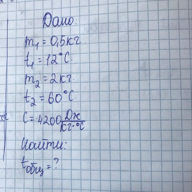в кастрюлю влили воду массой m1=0,5kg при t1= 12*С , Потом добавили воду массой m2=2.0kg, t2 = 60*C. удельная теплоемкость воды 4200Дж/кг*С