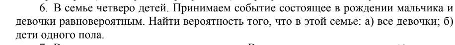 б) Пол не указан, следовательно первый ребенок может быть любого пола, вероятность рождения ребенка любого пола 1. Вероятность рождения второго ребенка такого же пола равна 0,5 (независимо от того какой будет пол, ибо события равновероятны), и так далее.