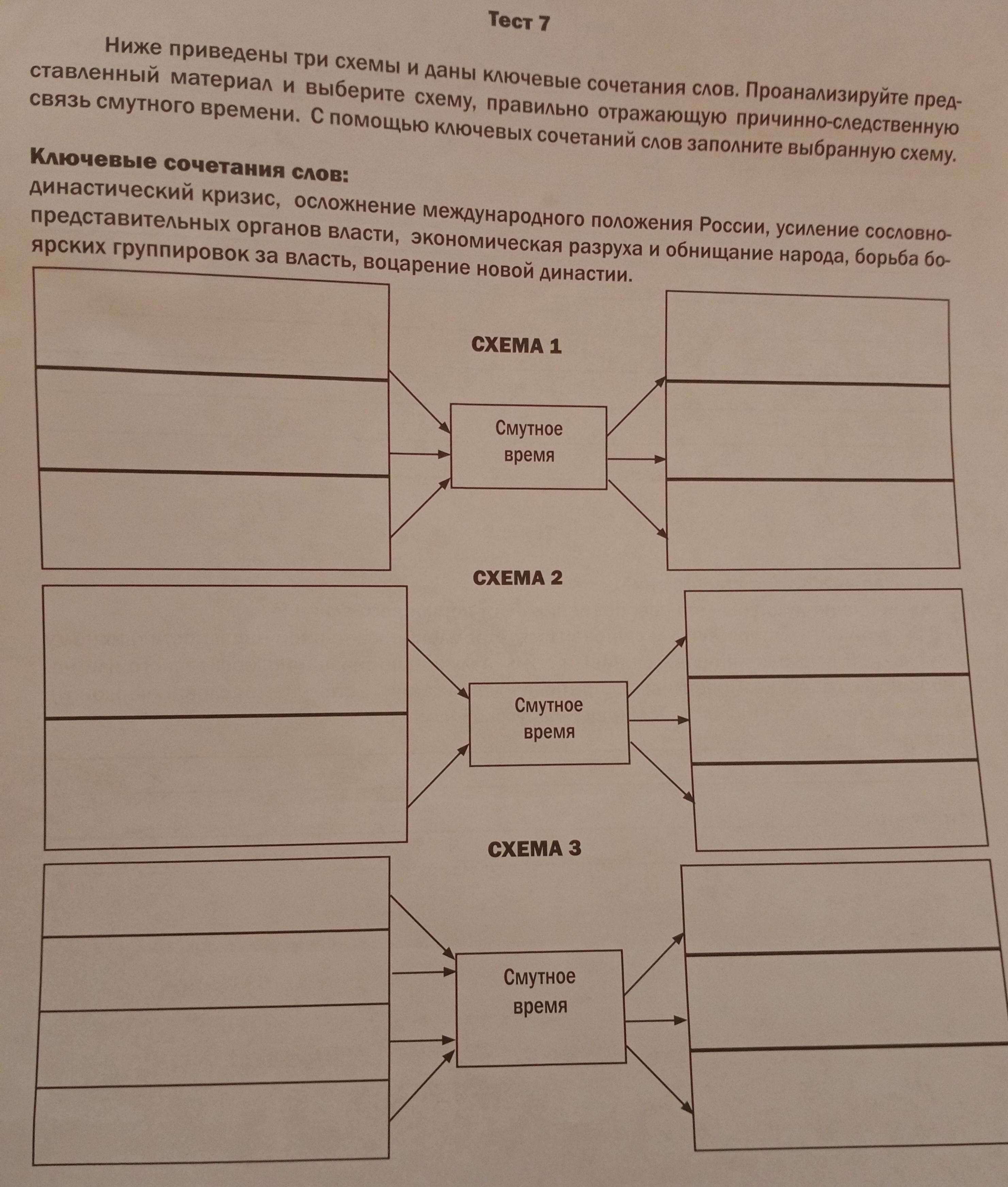 Ниже приведены три схемы и даны ключевые сочетания слов. Проанализируйте представленный материал и выберите схему, правильно отражающую причинно-следственную связь смутного времени. С помощью ключевых сочетаний слов заполните выбранную схему.