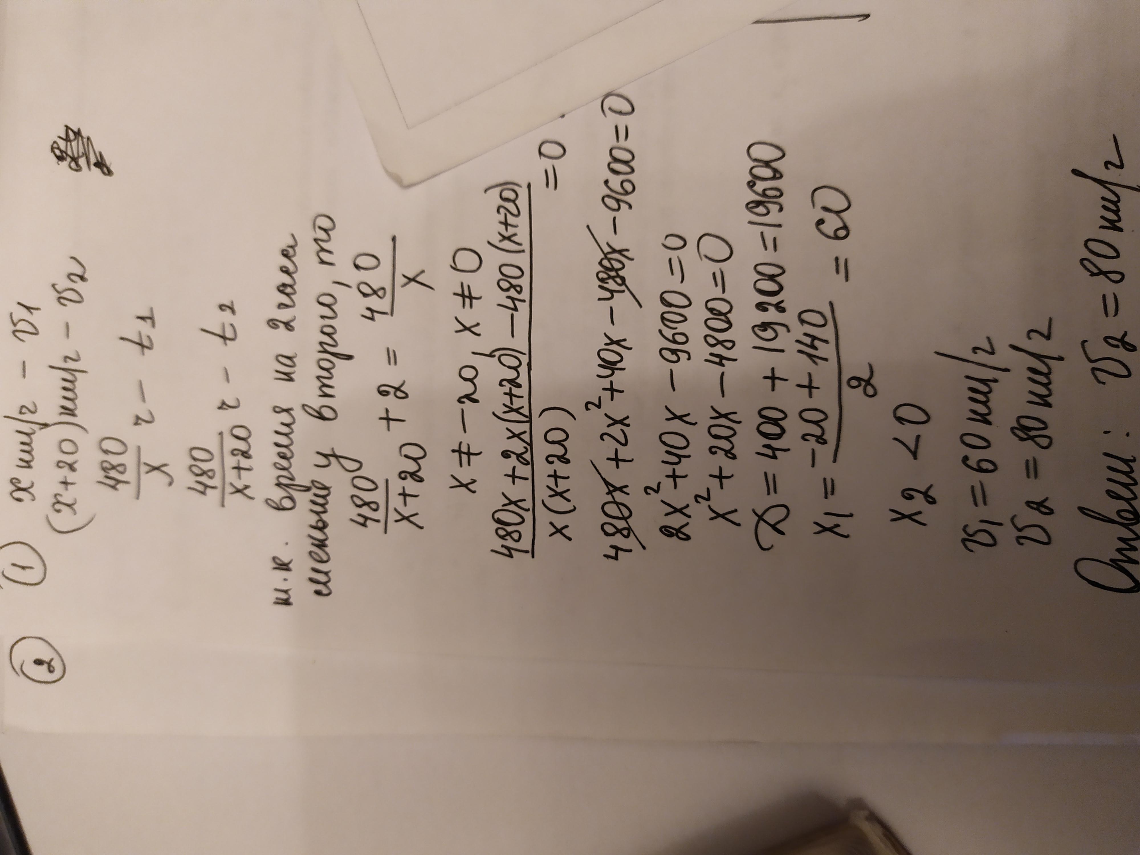 1)Два автомобилиста одновременно отправились из пункта А в пункт Б, расстояние между которыми 480 километров. Второй ехал со скоростью, на 20 км/ч большей, чем скорость первого, и прибыл в пункт В на 2 часа раньше. Найти скорость автомобиля, прибывшего в пункт В первым. Ответ дайте в км/ч.
