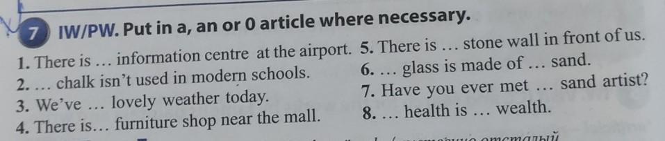 7 IW/PW. Put in a, an or 0 article where necessary.