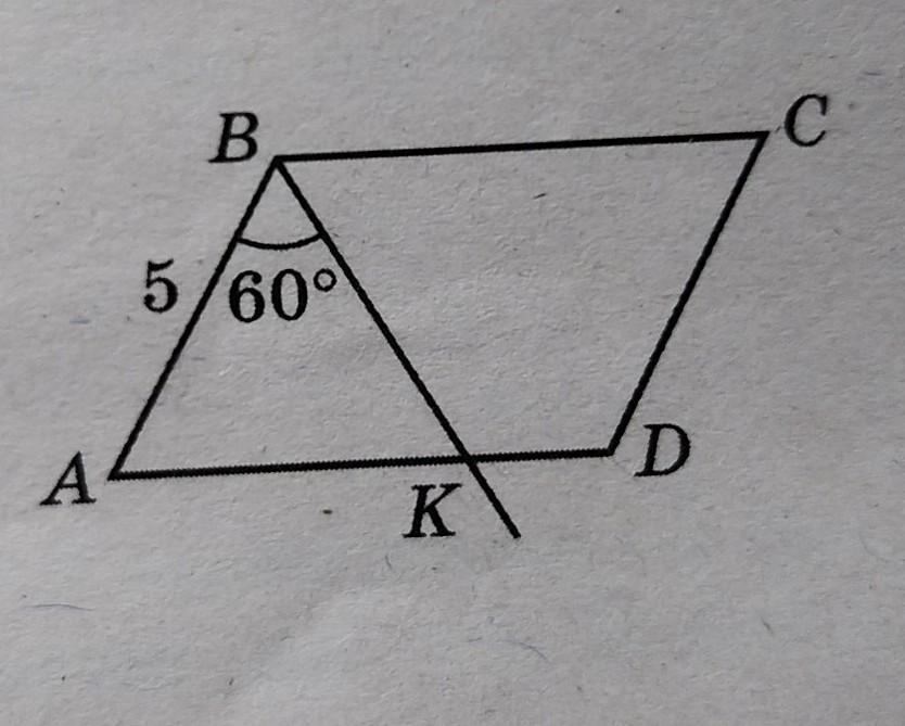 В паралелограмме ABCD биссектриса угла ABC пересекает сторону AD в точке K. AB = 5, угол ABK = 60°. Найдите периметр треугольника ABK.