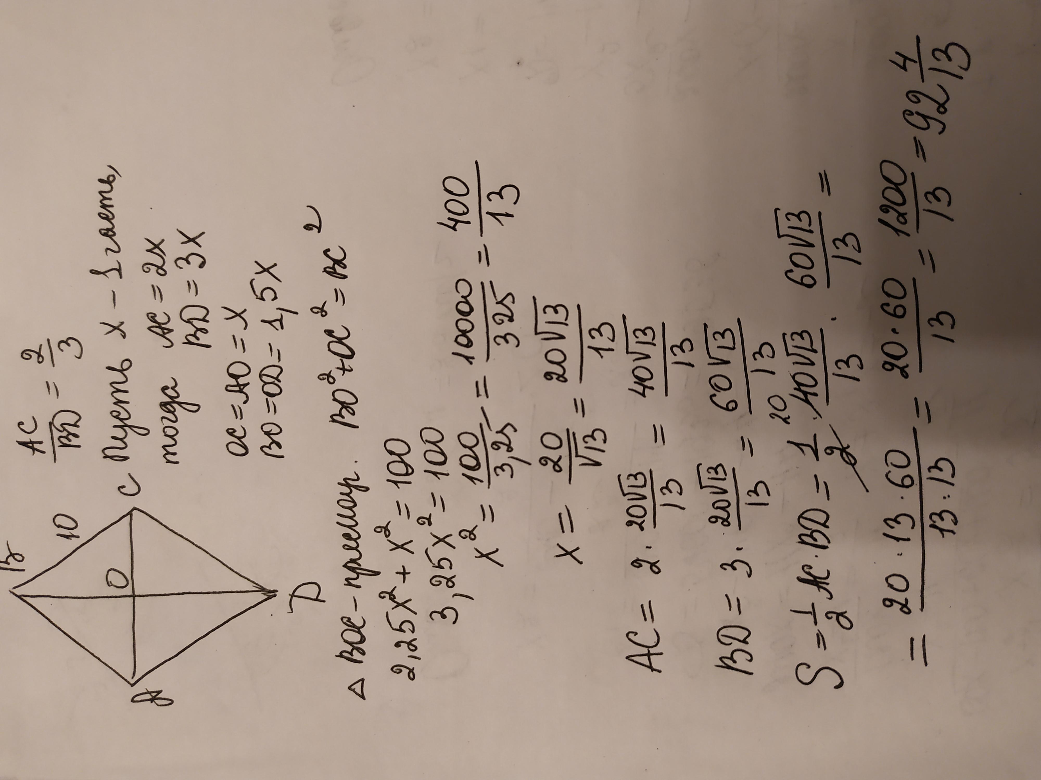 Вычислите диагональ и площадь ромба, если одна сторона равна 10, а соотношение диагоналей равно 2: 3.