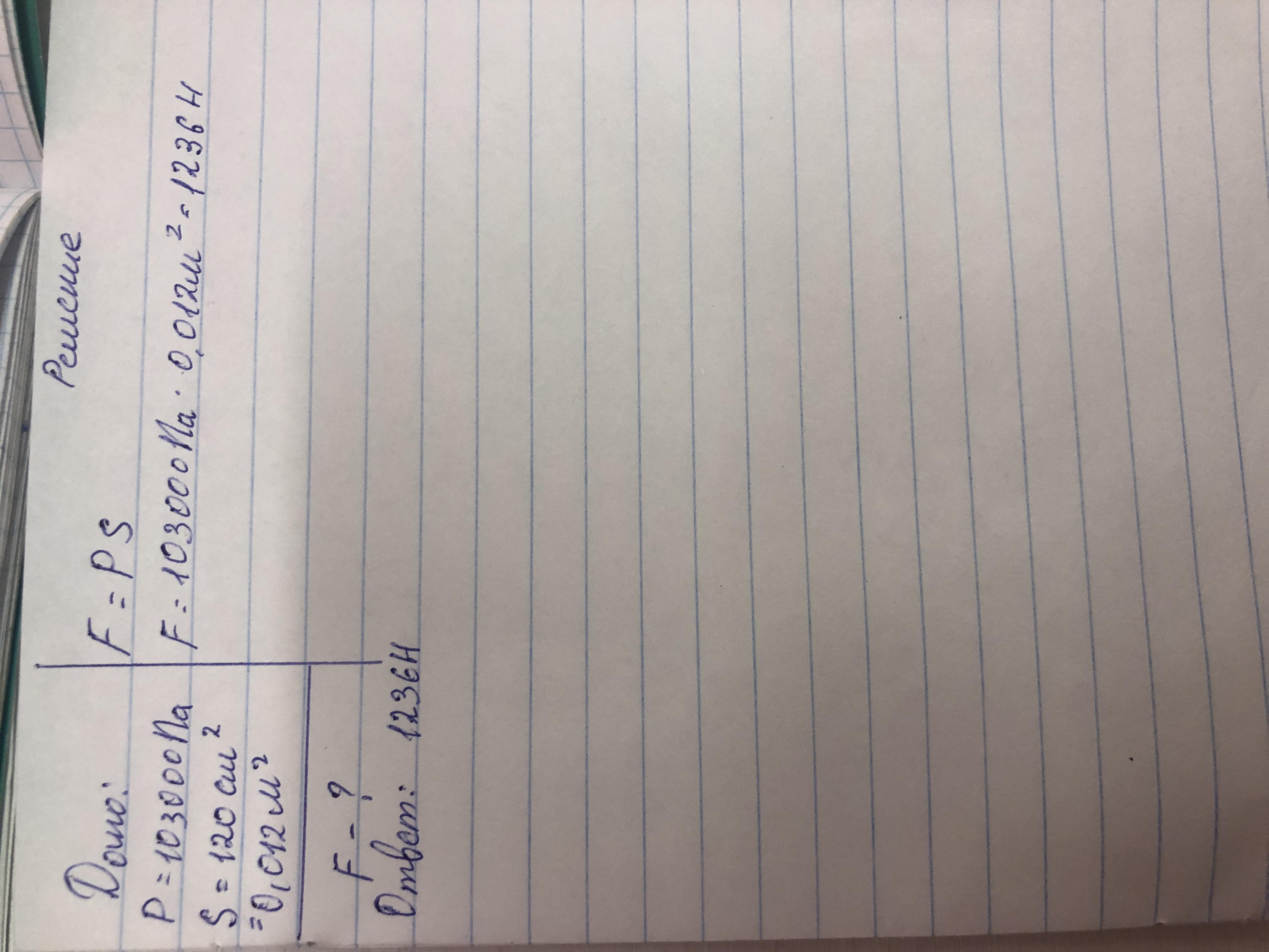 С какой силой действует газ на крышку в сосуде, если его давление равно 103000 Па, а площадь равна 120 см^2