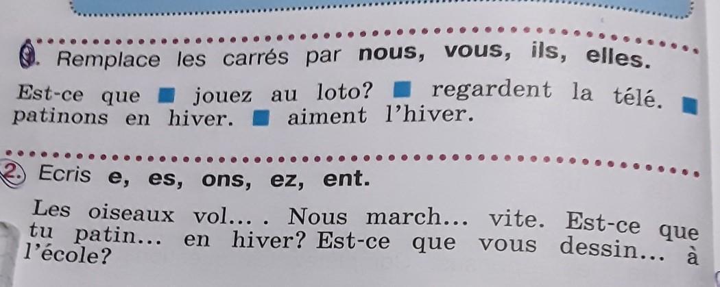2. Les oiseaux volent. Nous marchons vite. Est-ce que tu patines en hiver? Est-ce que vous dessinez à l'école?
