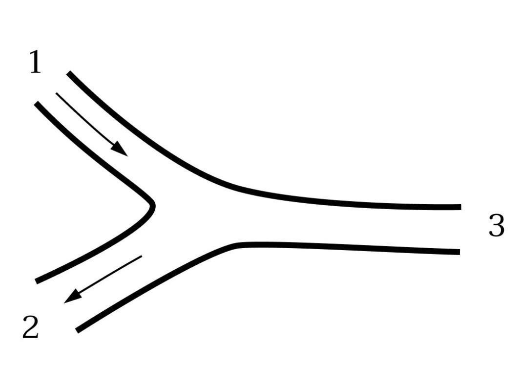 Участок трубопровода состоит из трёх труб так, как показано на рисунке, причём площади труб S1=S, S2=3S, S3=2S соответственно. Скорость течения воды по трубе 2 вдвое превышает скорость течения воды по трубе 1: v2=2v1. Направления течения воды в трубах указаны стрелочками.