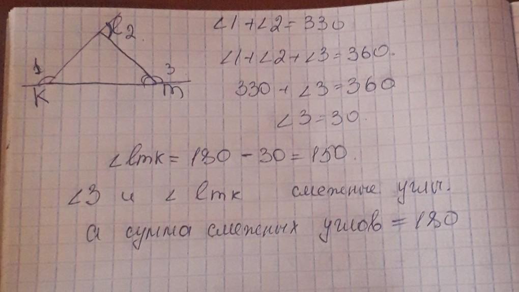 сумма градусных мер внешних углов треугольника klm взятых по одному при вершинах k и l равна 330 градусов. найти градусную меру внутреннего угла m
