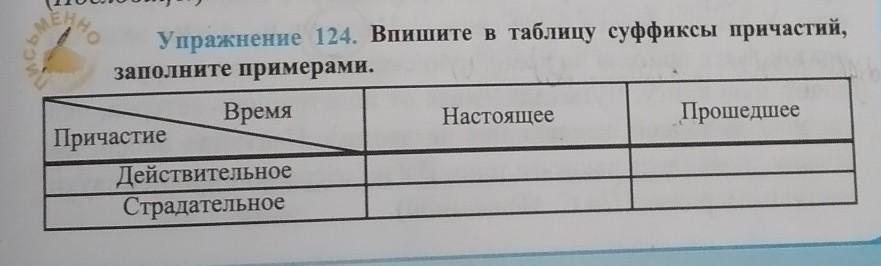 Упражнение 124 впишите в таблицу суффиксы причастий, заполните примерами. СРОЧНО ДАЮ 50 БАЛЛОВ