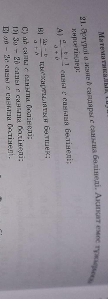 Различные числа a и b делятся на c. Укажите термин false: a - b + 1 A) число делится на c; atb 2a - b B) сокращенная дробь; a + b C) число ab делится на c; D) Число Za + 2b делится на число c; E) ab - 2c делится на c.
