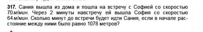 Сания за 2 минуты прошла 2*70=140 м. Изначально расстояние было 1078 м, значит осталось пройти до встречи 1078-140=938 м. Общая скорость девочек 64+70=134 м/мин. Тогда время до встречи 938/134=7 мин. Значит Сание надо будет идти 2+7=9 мин.