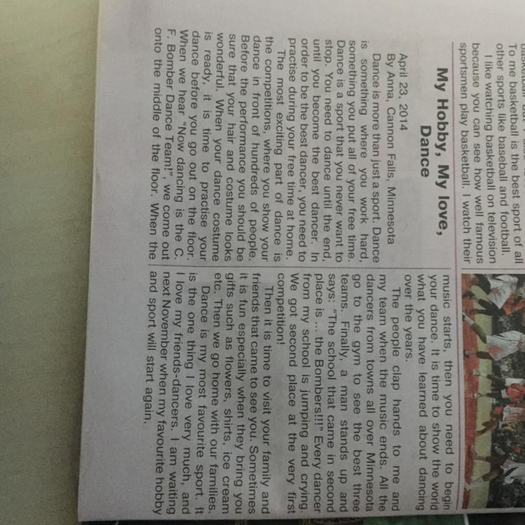Мое хобби, любовь моя, танцы 23 апреля 2014 г. Анна, Кэннон-Фолс, Миннесота Танец - это больше, чем просто спорт. Танцы - это то, на что вы много работаете, на что вы вкладываете все свое свободное время. Танцы - это спорт, от которого никогда не захочется останавливаться. Танцевать нужно до конца. пока вы не станете лучшим танцором. Чтобы стать лучшим танцором, вам нужно заниматься в свободное время дома. Самая захватывающая часть танца - соревнования, где вы показываете свой танец перед сотнями людей. Перед выступлением убедитесь, что ваши волосы и костюм великолепны. Когда ваш танцевальный костюм готов, самое время потренироваться в танце, прежде чем выходить на паркет. Когда мы слышим: «Теперь танцует танцевальная команда C. F. Bomber!», Мы выходим на середину этажа. Когдамузыка начинается, тогда вам нужно начать свой танец. Пришло время показать миру, что вы узнали о танцах за эти годы. Когда музыка заканчивается, люди хлопают в ладоши мне и моей команде. Все, кто идет в спортзал, чтобы увидеть троих лучших, говорят: «Школа, занявшая второе место, это ... Бомбардировщики !!!» Все танцоры моей школы прыгают и плачут. конкуренция! танцоры из городов по всей Миннесоте. Наконец, мужчина встает, и Мы заняли второе место у самых первых друзей, которые пришли к вам. Иногда это весело, особенно когда они приносят вам подарки, такие как цветы, рубашки, мороженое и т. Д. Затем мы идем домой со своими семьями. в следующем ноябре, когда мое любимое хобби и спорт снова начнутся. Тогда пришло время навестить вашу семью, и танцы - мой самый любимый вид спорта. Это то, что я очень люблю, и люблю своих друзей-танцоров, я жду.